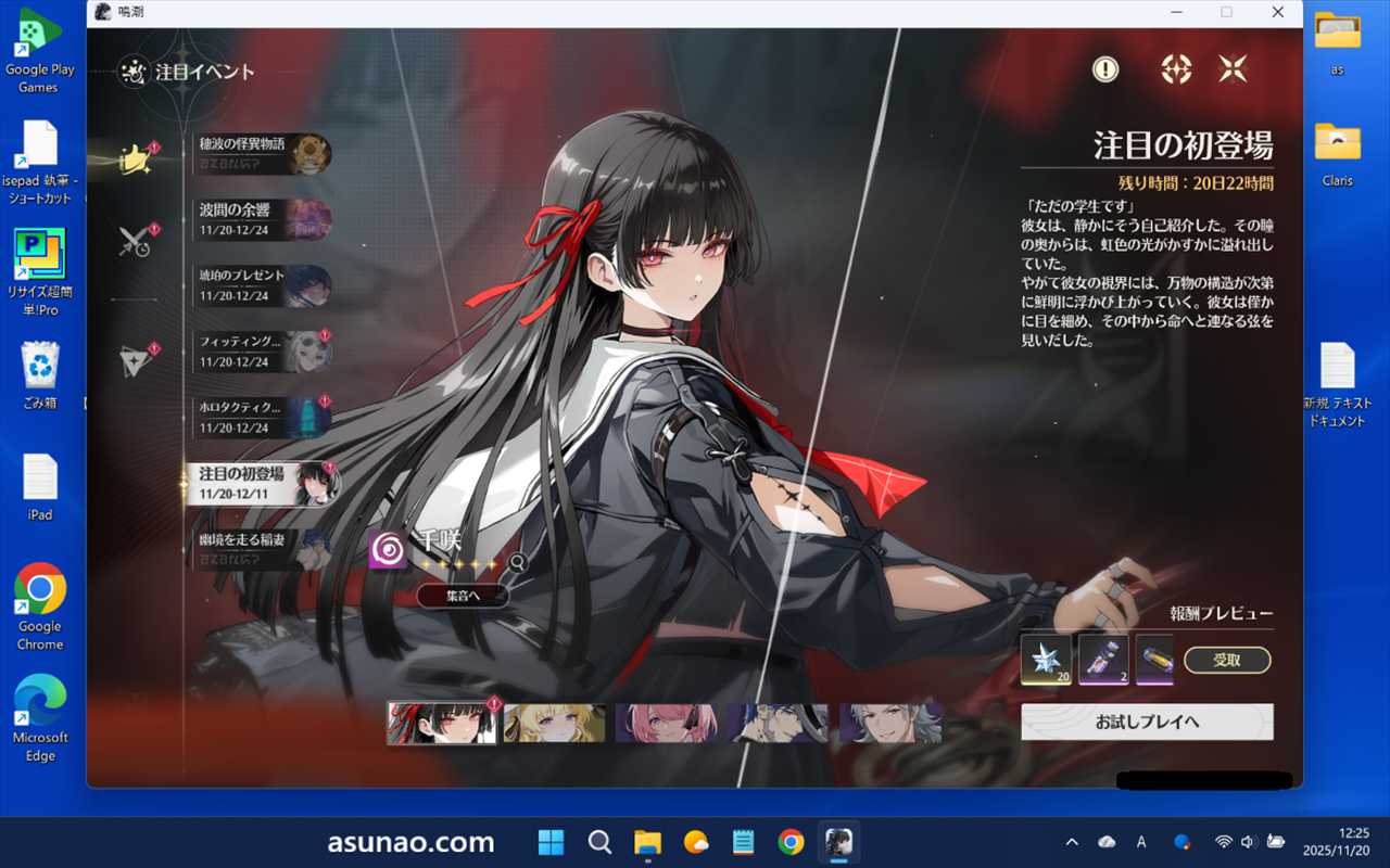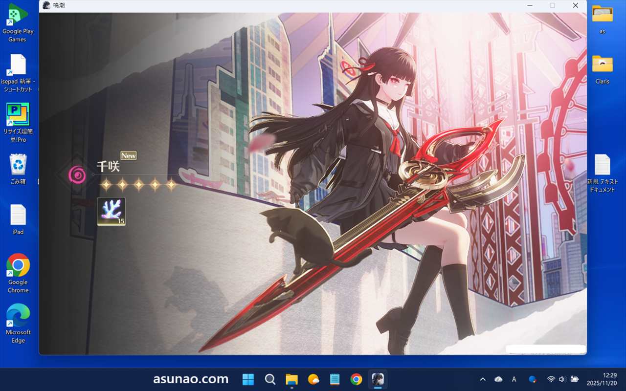 注目の初登場にて、千咲をプレイしてみたのですが、面白そうに感じたのでガチャ回して千咲モチーフ武器をゲットしています。