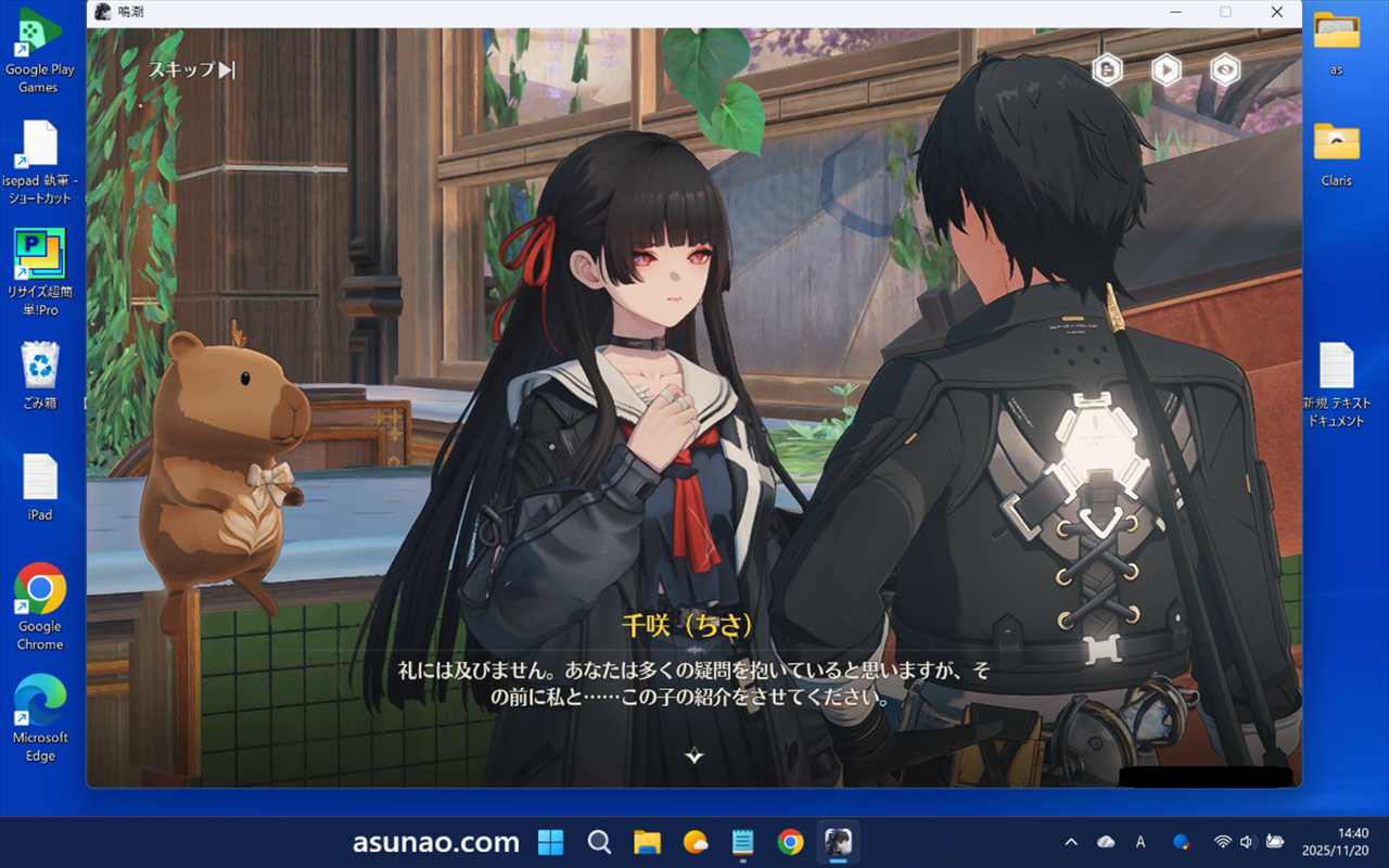 その後に戦闘があり、そこで漂泊者が共鳴解放を行った瞬間に、千咲が現れて、一緒に戦闘するシーンが表示され、カピパラと一緒に逃げます。