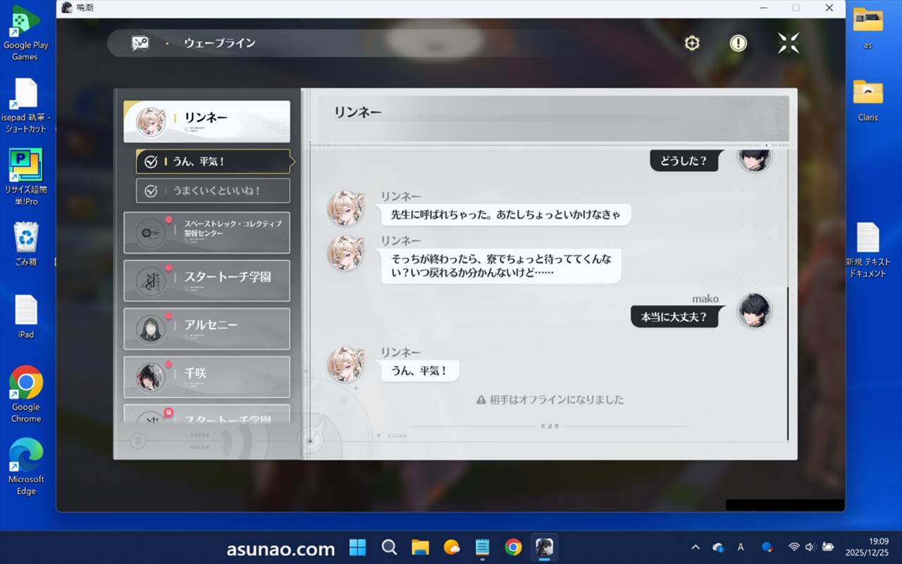 その後にリンネーから連絡あり。ウェーブラインのメッセージを返信していたら、何と!千咲や仇遠からのメッセージも有ったのでビックリ!